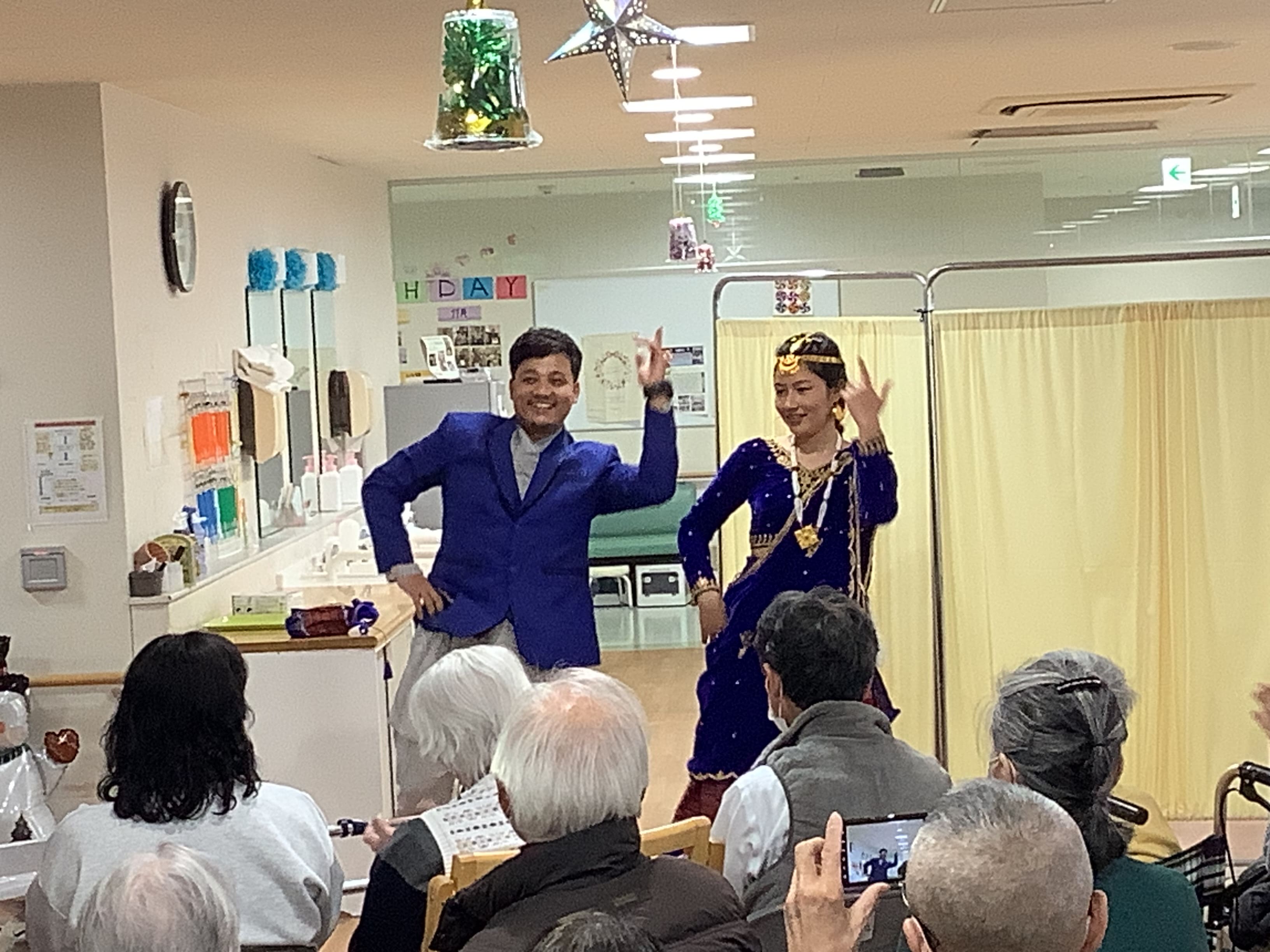【国立あおやぎ苑】 クリスマス会開催 2025年12月26日(金) 令和7年 国立あおやぎ苑 クリスマス会開催 12月23,24日の2日間にわたって開催されました! 今年は、久し振りに家族同伴で行われ、各フロア多くの方々が来苑され楽しんで頂きました。 通所の歌姫登場! 本館通所 リハビリ部 縄文棟通所 縄文棟4階 本館4階 クリスマス会の食事 ネパール民族衣装で、お祝いの踊り