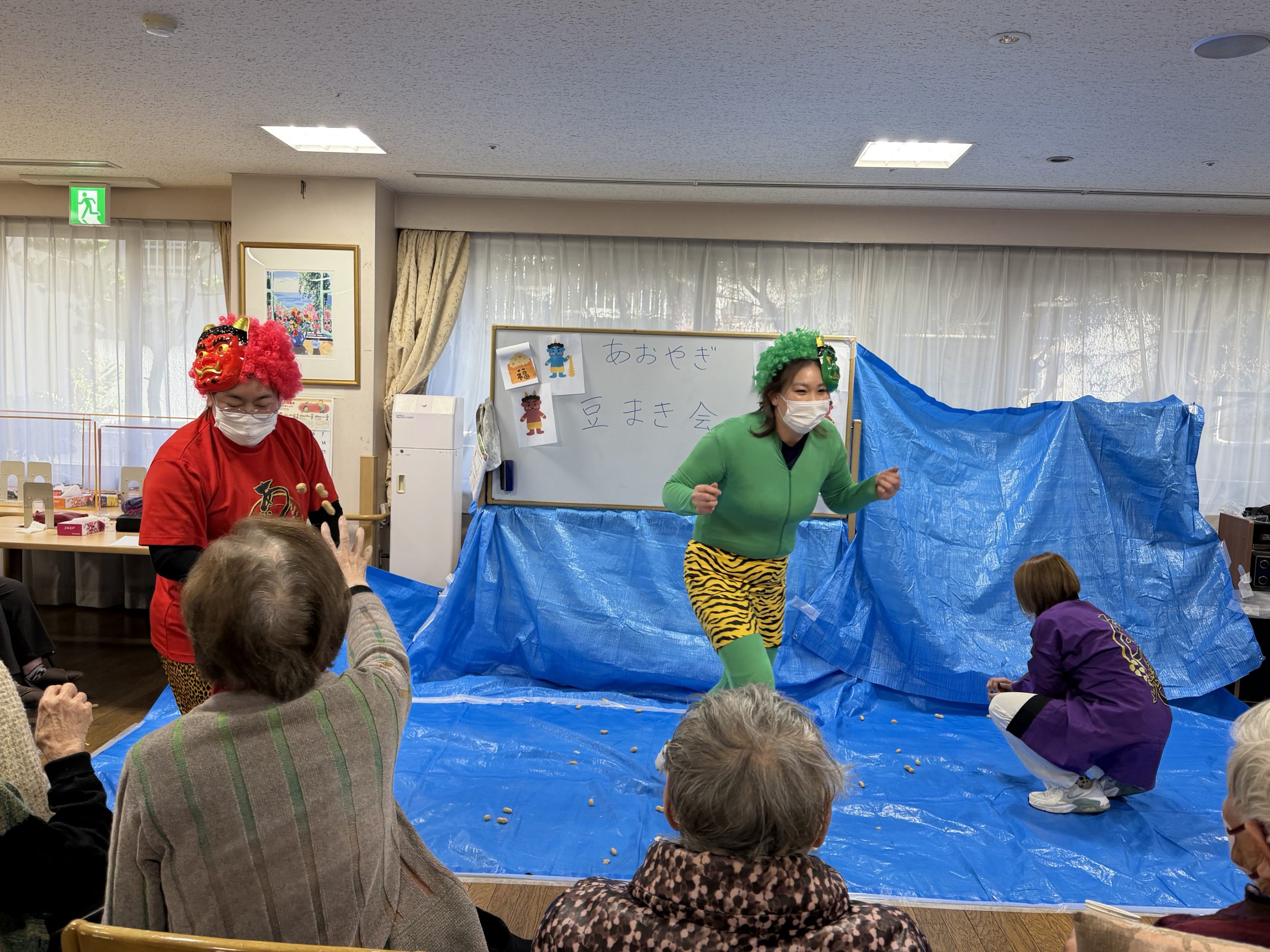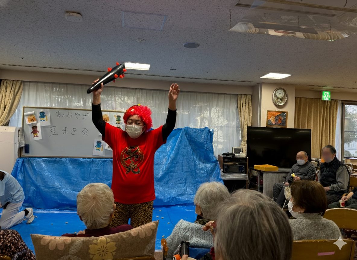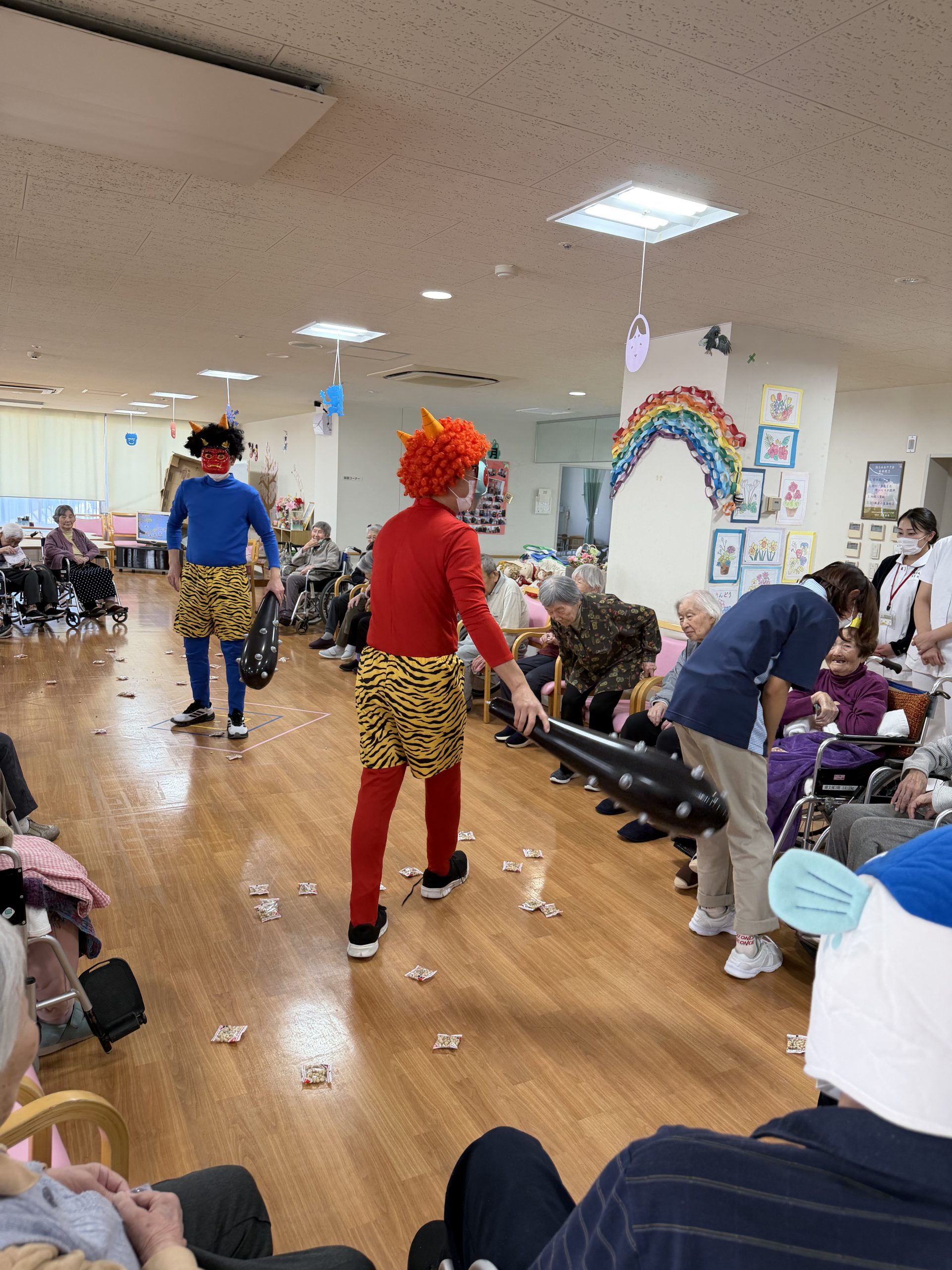 【国立あおやぎ苑】 鬼は外! 2026年02月06日(金) 鬼は外! 通所・入所棟の全フロアで節分の豆まきを行いました。 赤・青・緑の色とりどりの鬼たちが現れて大暴れしましたが、こちらも大豆や落花生、ピンポン玉などを使って対抗! 「鬼は外!福は内!」と元気な声が響き渡り、しっかりと邪気を払うことができました。 明日からは、いよいよ暦の上でも春がやってきます。 通所リハ 通所リハ 入所棟 入所棟